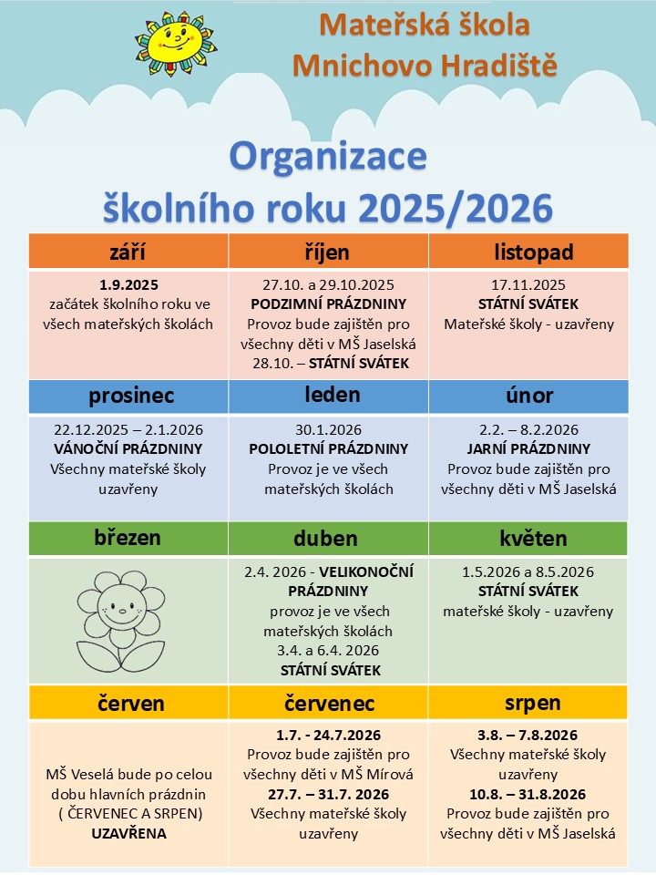 Jarní prázdniny: 02.02.2026 – 08.2.2026 – provoz zajišťuje MŠ JASELSKÁ